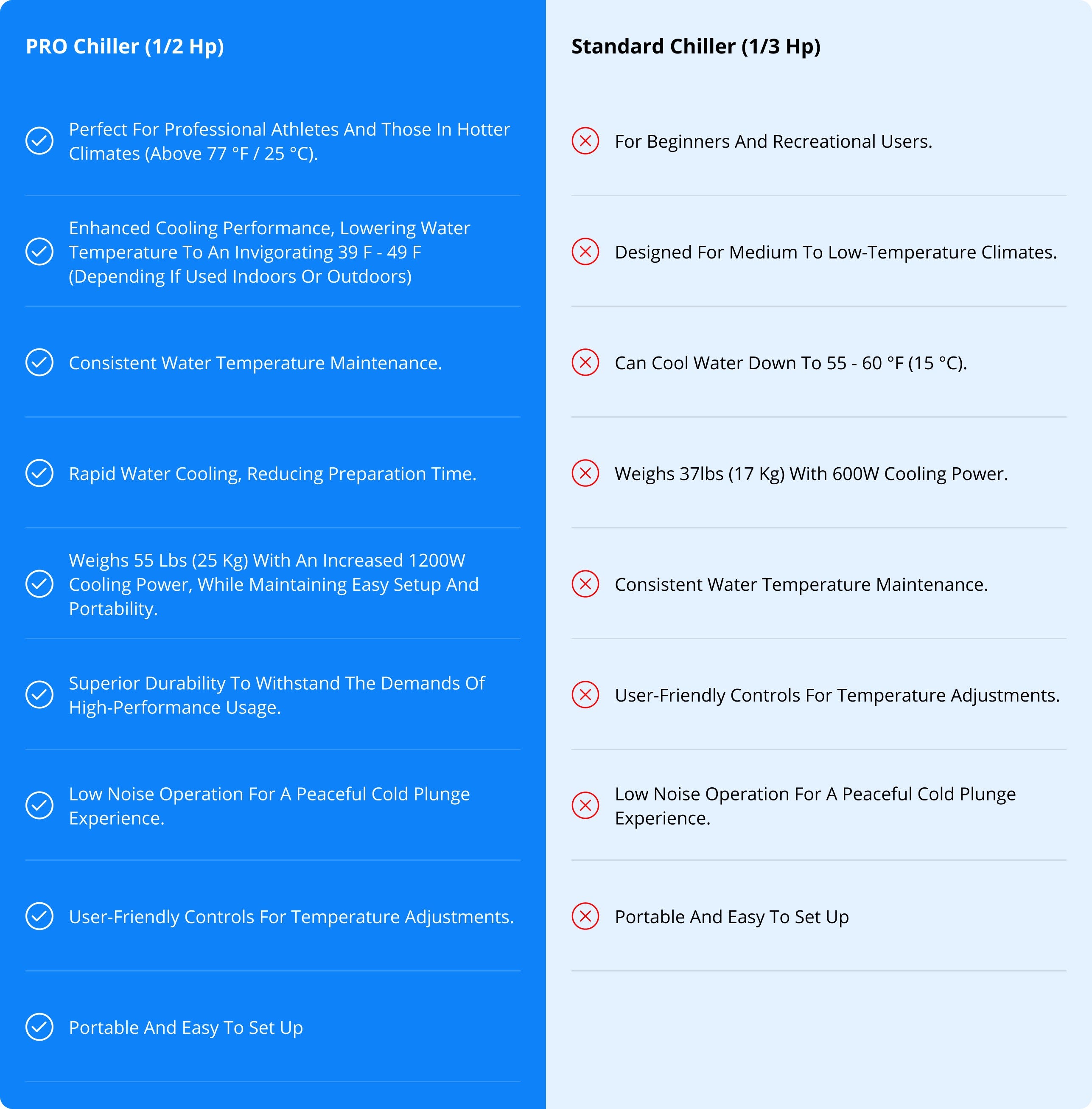 The PRO Chiller offers enhanced cooling performance, consistent water temperature maintenance, and rapid water cooling. The Standard Chiller is designed for beginners and recreational users, providing cooling down to 55 - 60 °F.