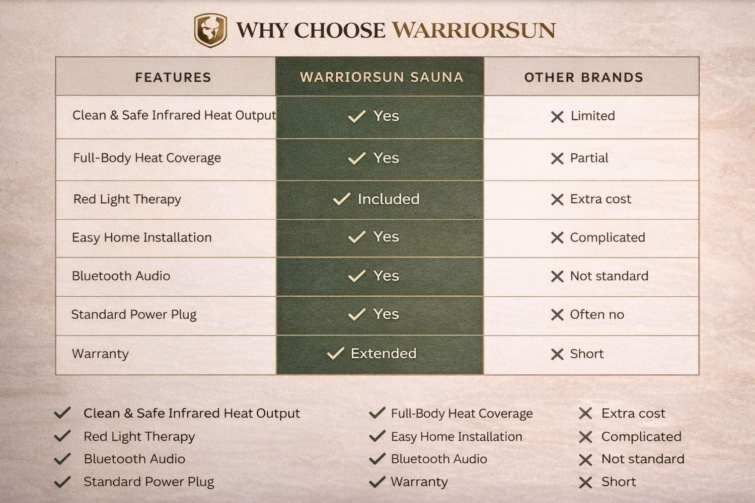 When investing in a home infrared sauna, quality, safety, and performance matter. WarriorSun saunas are engineered to deliver clean, full-body infrared heat ensuring a comfortable and effective wellness experience at home.